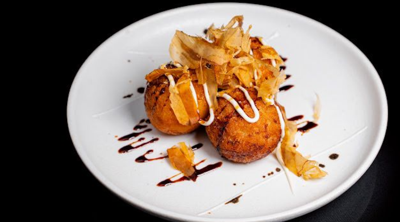 Pollo frito, aguacate, crema de queso, sésamo, cebolla crujiente, teriyaki y mayonesa