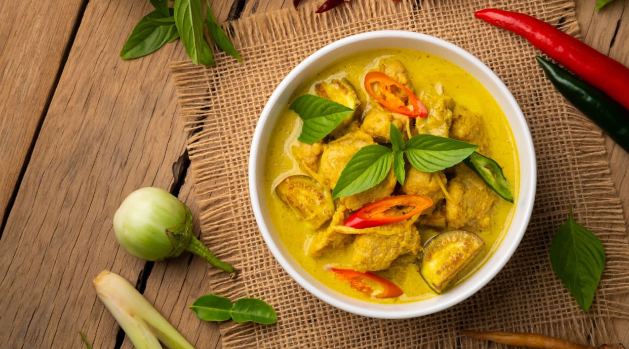 Curry verde picante estilo tailandés (Sopa) con leche de coco y verduras, acompañado de arroz. (La base del curry verde es pimiento verde picante) Elige entre: Pollo, Solomillo Cerdo, Tofu.