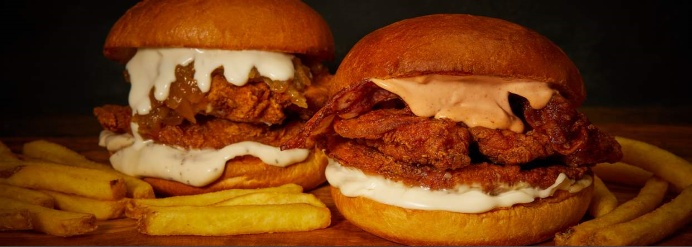 Nuestro clásico con doble carne de pollo crujiente (2x100g), tomate, lechuga, pepinillos y la mejor salsa mayonesa con un toque picante!