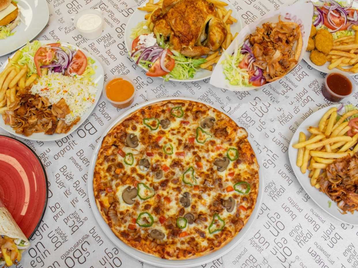 Carne de ternera, carne de pollo, verdurass, mayonesa, pan turco, patatas y bebida