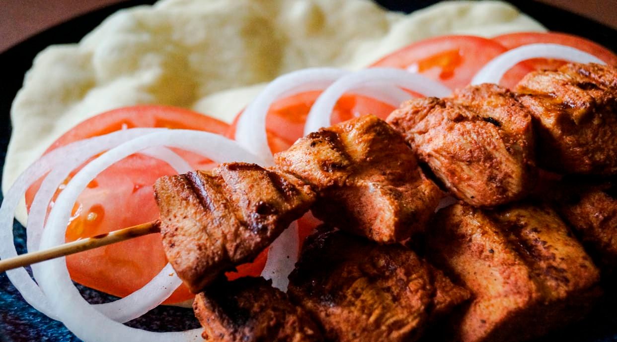 Surtido de seis brochetas, shickebab de pollo, shickebab de carne, shish taouk y un kebab de termanesco. Acompañado de lechuga, tomate, patatas fritas y pan de pita