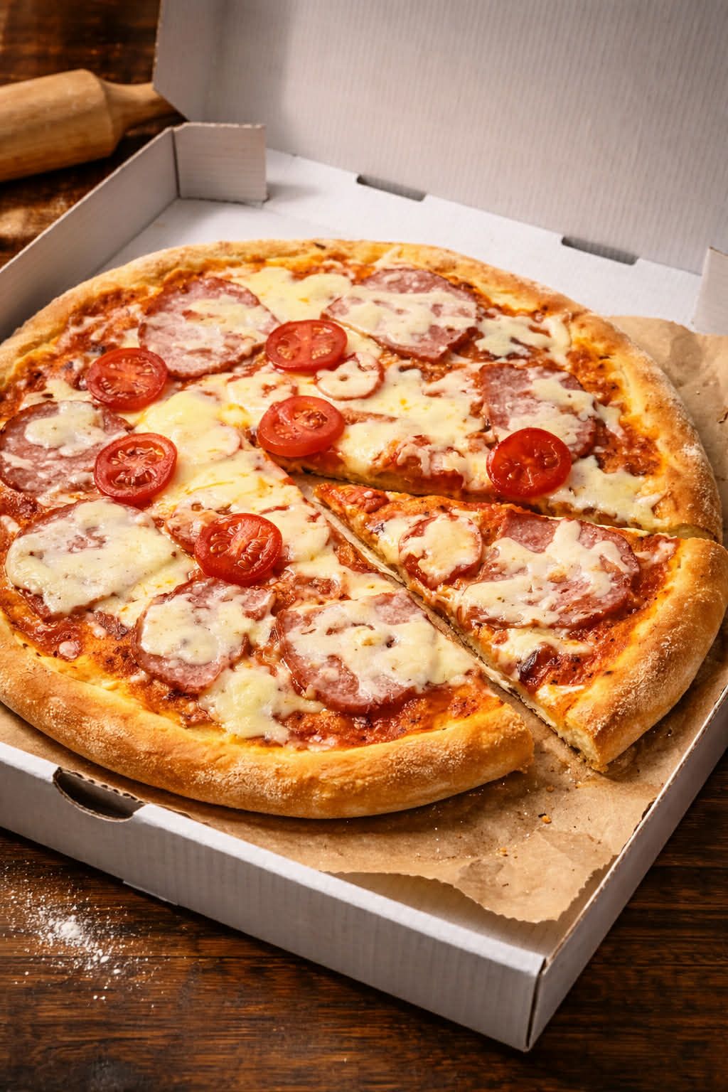 ცომი, ძეხვი პეპერონი, ყველი მოცარელა, საფირმო სოუსი, ორეგანო