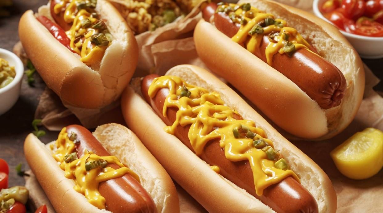 ფუნთუშა, პანირებული სოსისი, კეჩუპი, მაიონეზი.