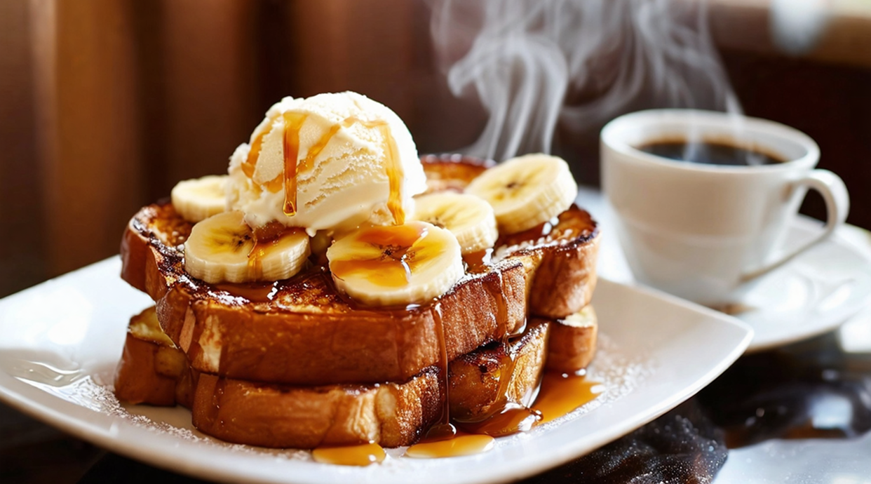 French toast with banana, caramel and ice cream