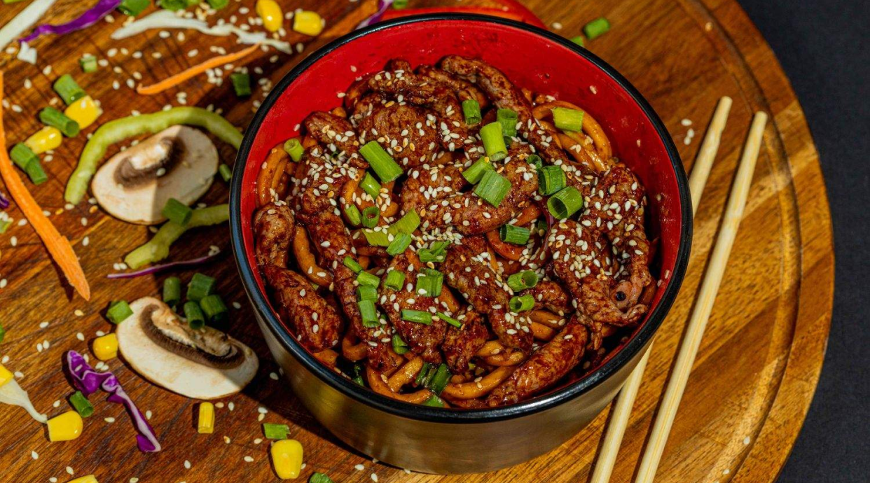 ლაფშა, საქონლის ხორცი, კომბოსტო, ვარდისფერი კომბოსტო, მწვანე ბულგარული, წითელი ბულგარული, მწვანე ხახვი, სოიოს სოუსი, სეზამის მარცვლები