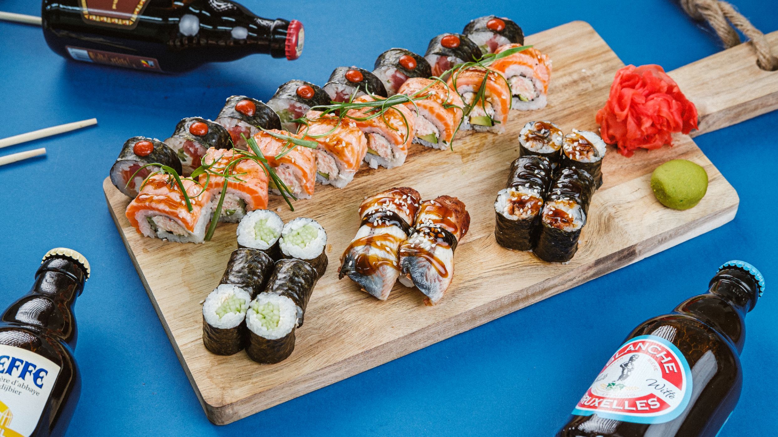 ბრინჯი,ნორი,კიტრი,ავოკადო,ორაგული,სეზამის მარცვალი.