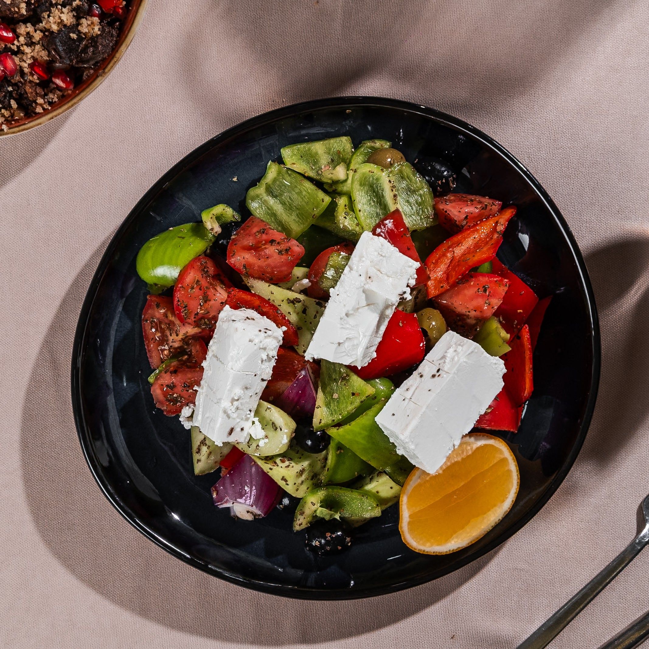 ფეტა ყველი, წითელი ხახვი, წითელი ბულგარული,მწვანე ბულგარული,ორეგანო, მარილი, ზეითუნის, ლიმონი, ზეთის ხილი შავი, ზეთის ხილი მწვანე