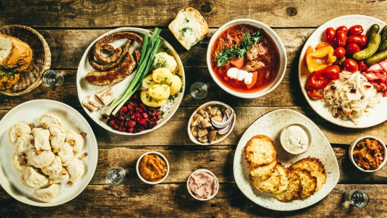 Red beets, Cabbage, Potatoes, Carrots, Onion, Garlic, Tomato paste, Bay leaves, Salt and pepper, beef
