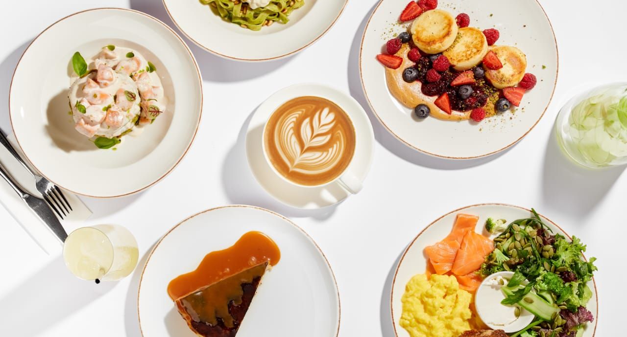 cottage cheese pancakes (3 pcs) with cream cheese, mango puree, canned peaches and coconut crumble