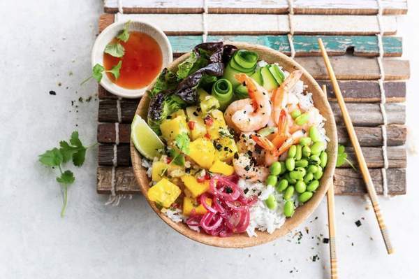 Riso venere integrale e quinoa, tonno pinna gialla, alghe wakame, mais, mango, cavolo cappuccio, mayo al lime, mayo spicy