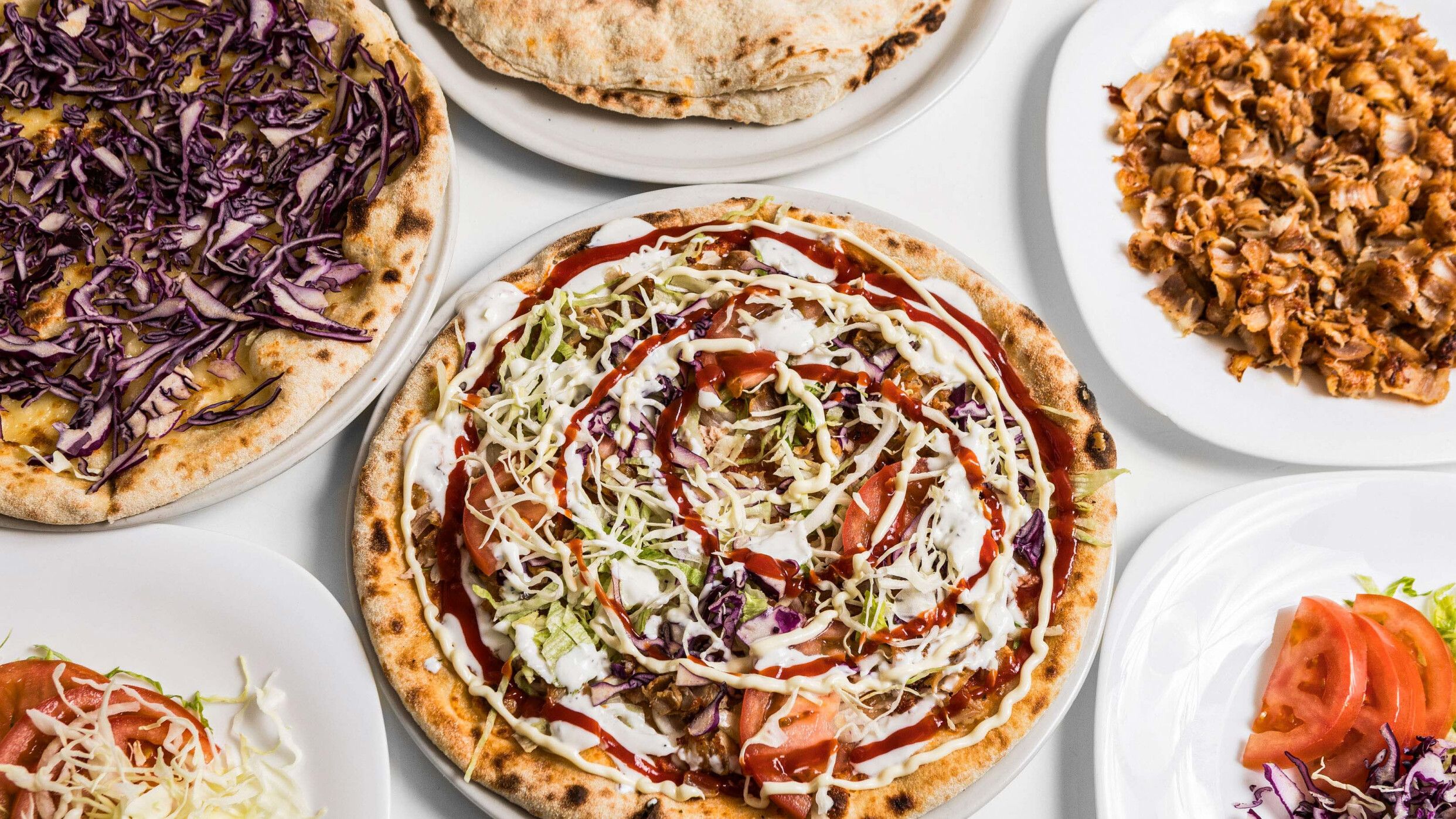 Pomodoro, mozzarella, kebab, insalata, pomodori, cipolle, salse