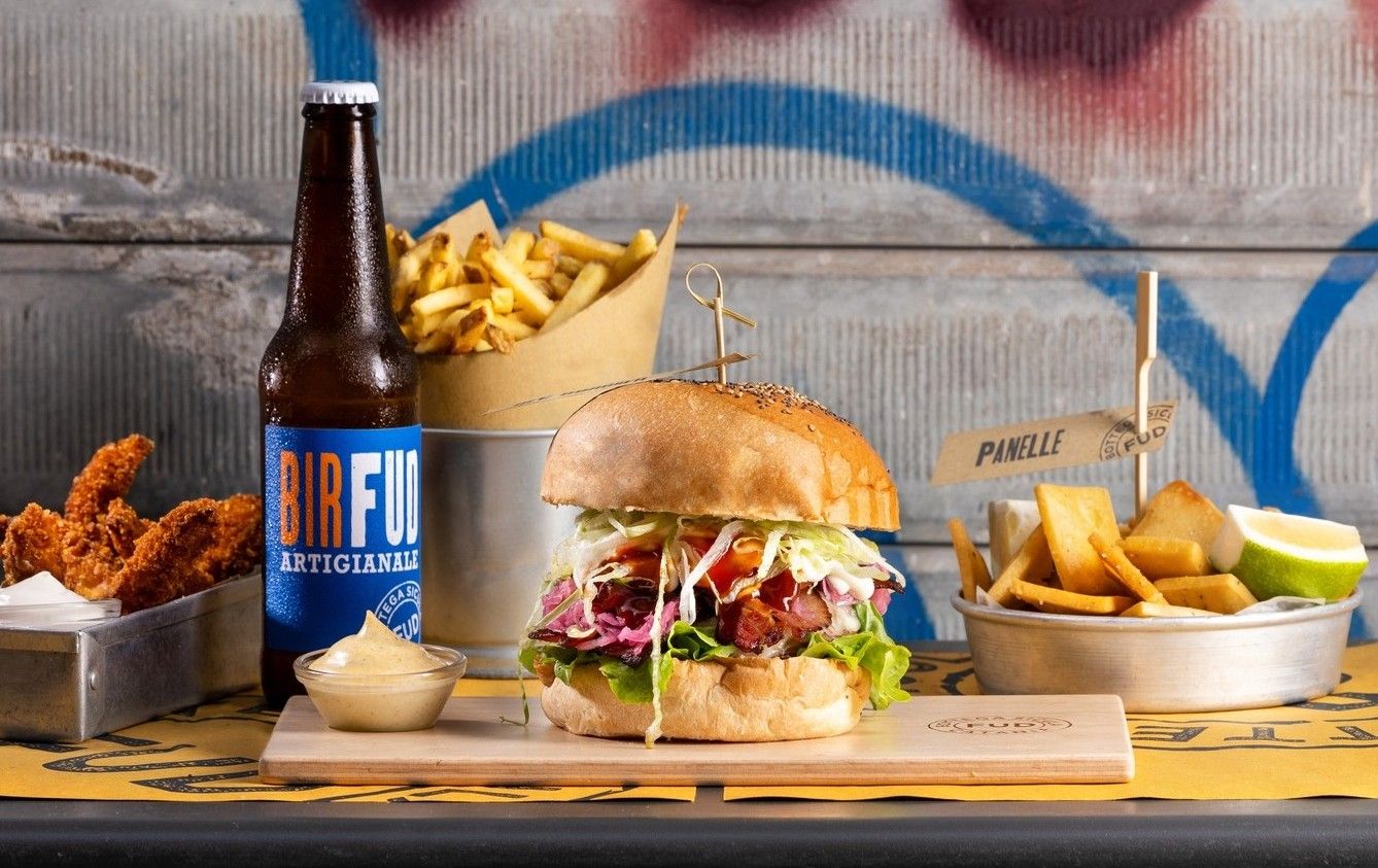 Burger di manzo siciliano, uovo di fattoria, provola delle Madonie, guanciale croccante di suino nero dei Nebrodi, pomodoro, insalata, olio extra vergine d'oliva Fud, checiap e maio Fud, servito con spicchi di patate a pasta gialla con buccia