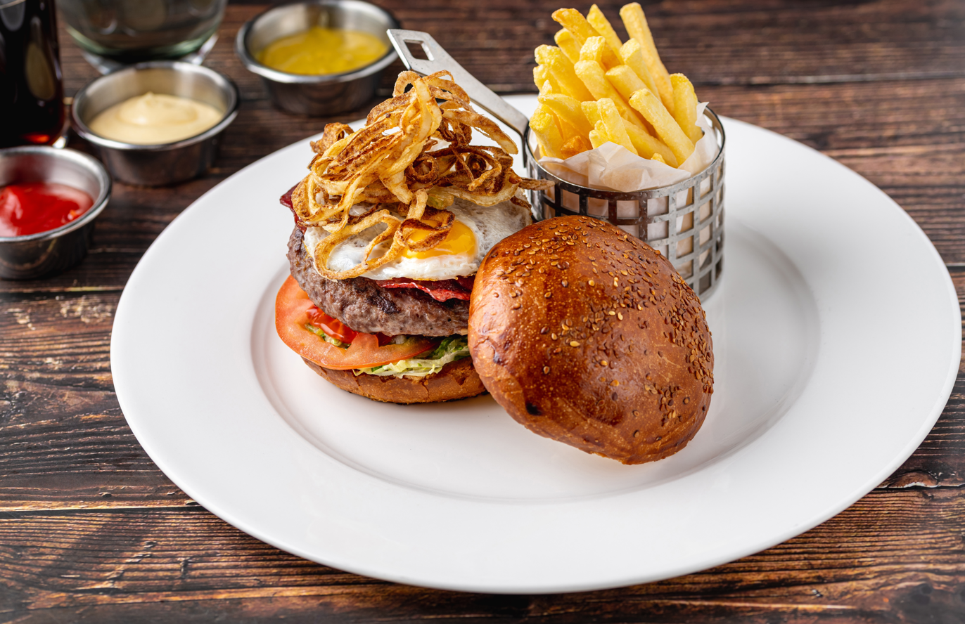 Hamburger di vitello, scamorza, iceberg, pomodoro, cipolla caramellata, bacon, uovo fritto, maionese, salsa bbq