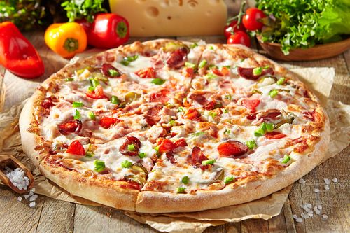 Pomodoro, mozzarella, prosciutto cotto, champignon, carciofini, olive, spianata piccante