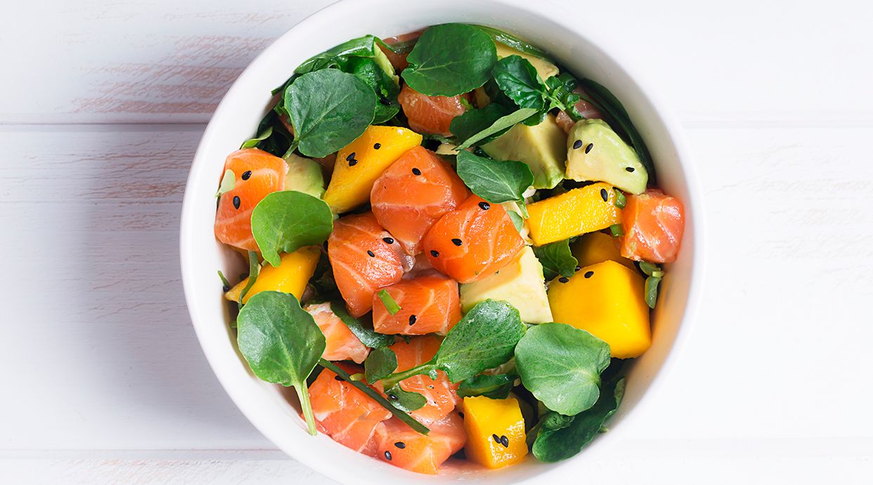 Riso bianco, salmone, gamberi, edamame, avocado, ananas, zucchine, granella di mandorle, semi di papavero, salsa avo maio