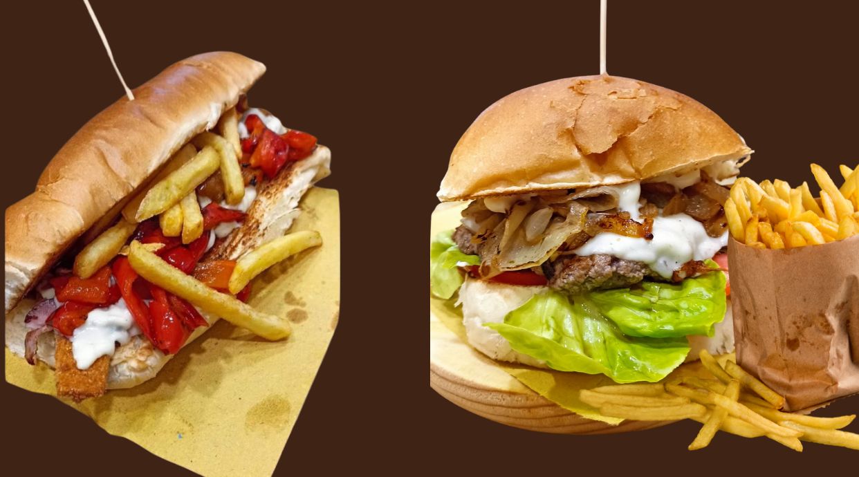 Doppio hamburger, insalata, pomodoro, sottiletta, provola, melanzane a funghetto, ketchup, maionese