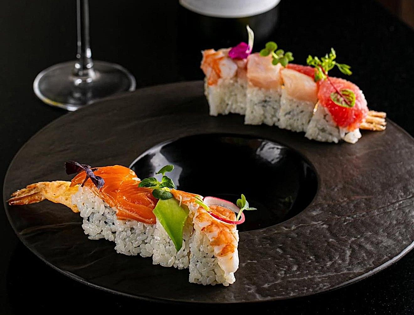 Gambero rosso, ricciola, zucchine in tempura e maionese allo zenzero