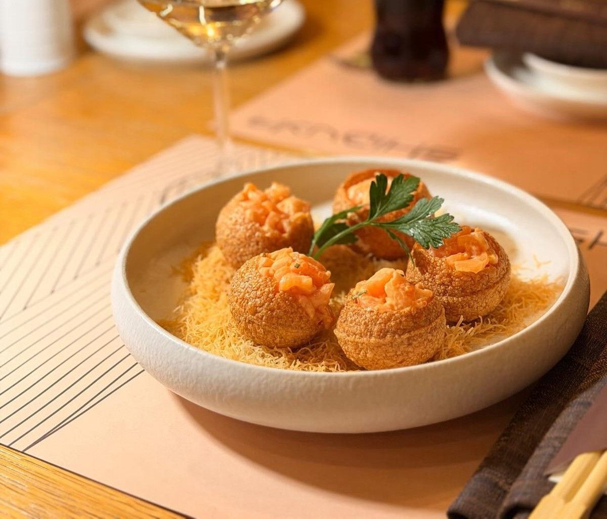 Bon bon con cubetti di salmone ,maiopiccante e tobiko