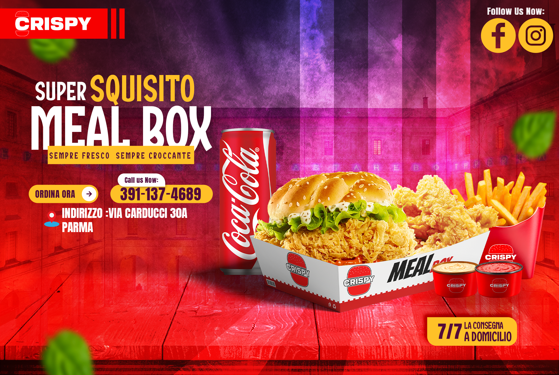 Crispy ofereix productes de la categoria «RESTAURANT». Consulta’n la llista de productes per veure què pots demanar. No dubtis a consultar també altres establiments de la categoria «RESTAURANT» disponibles a Parma.