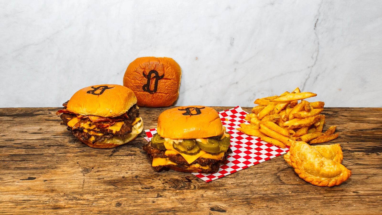Doppio smash Angus Argentino con doppio cheddar, doppio bacon e cipolla crispy + patatine + bibita.