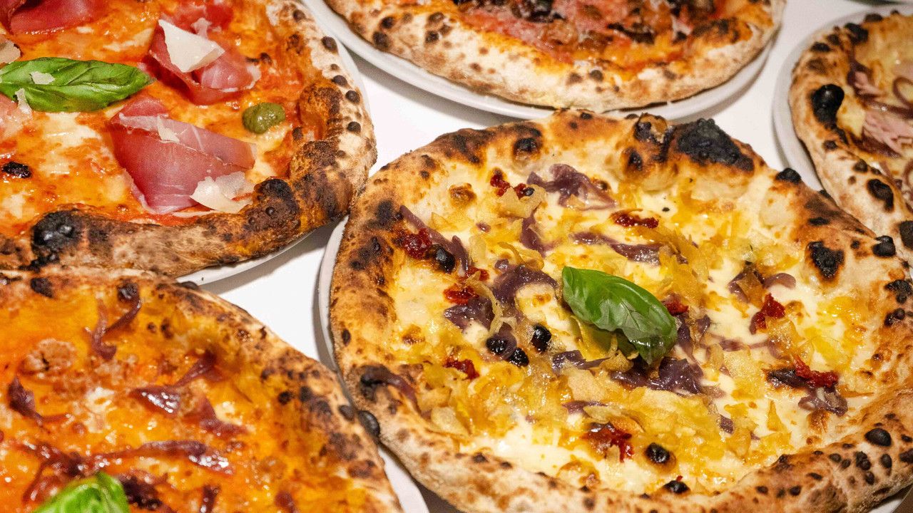 Fior di latte d’Agerola, pomodoro, spianata piccante, patate gialle di Avezzano, gorgonzola DOP, rosmarino, basilico, olio EVO
