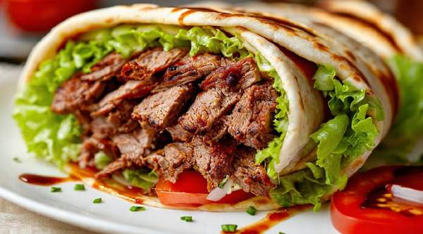 Тонкий приправленный фирменным красным соусом лаваш, сочная маринованная говядина, ароматный фри, свежий лук, соленые огурцы, фирменные красный и белый соусы.