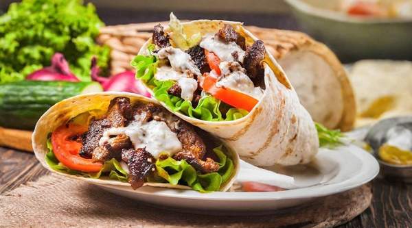 Нежное куриное мясо,помидоры,огурцы,легкий овощной салат (капуста,морковь,укроп)томатный соус,чесночный соус.