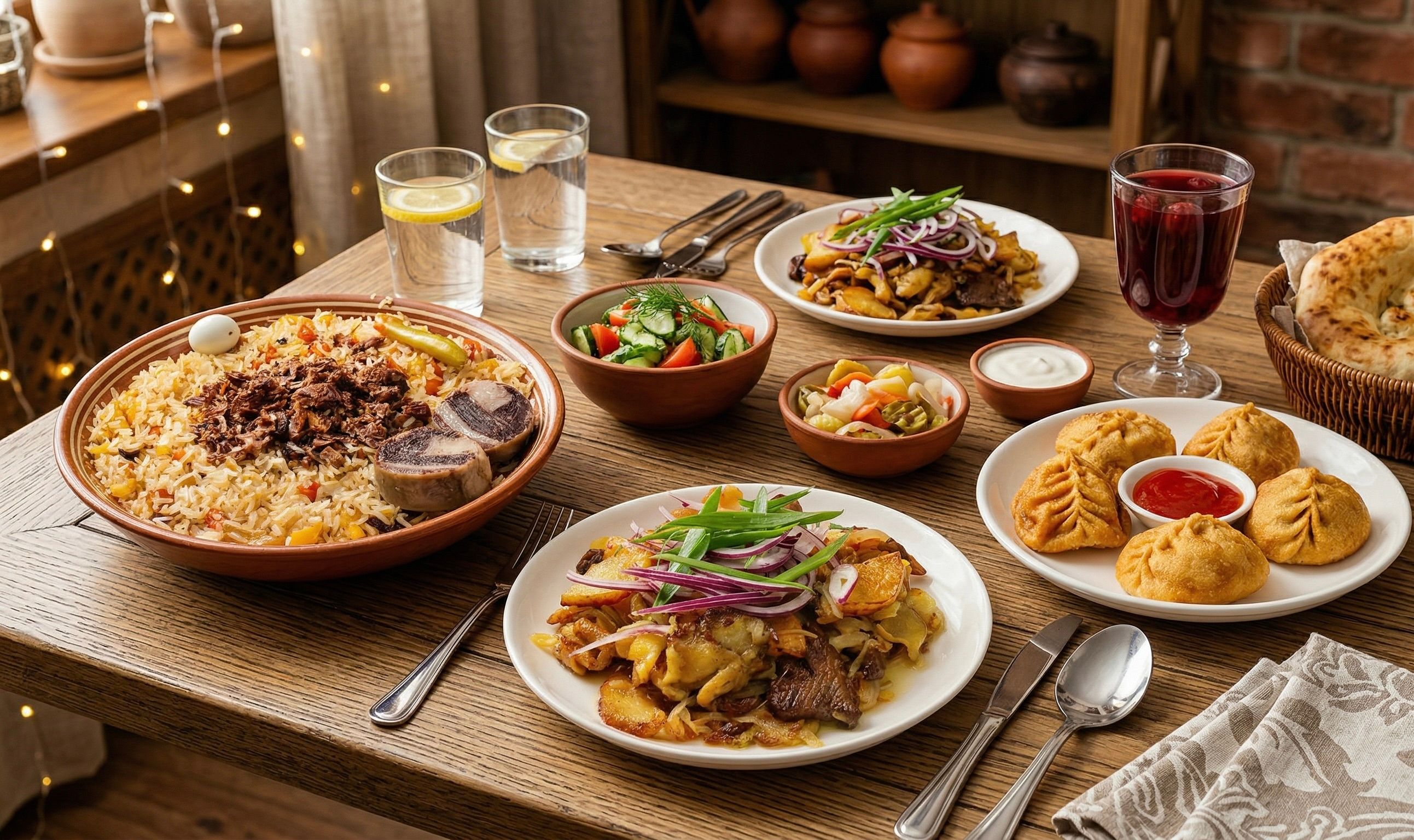 Мясо говядина, рис лазер, куркума, лук, зира, нут, изюм, желтая морковь, красная морковь, перепелиные яйца