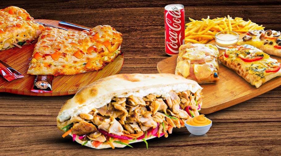 Shawarma,crème fraîche,mozzarella,jambon dinde fumée,crudités.