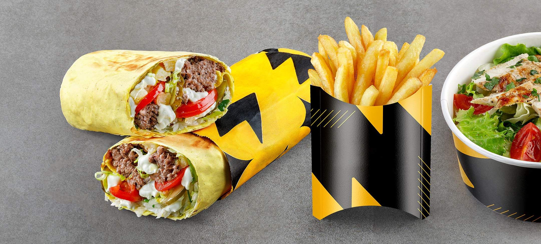 Ingrediente: lipie clasică, carne de vită, cartofi pai, cașcaval, roșii, varză, castraveți murați, pătrunjel, ardei jalapeño, ceapă roșie, sos picant, sos Doster - 400g