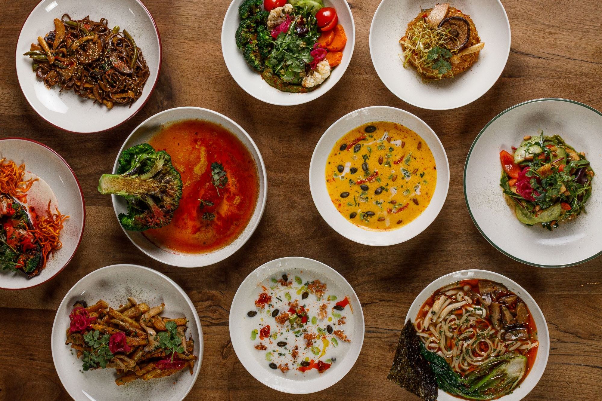 Broccoli la grătar, coajă de lămâie și lime, sos asiatic (yuzu, ponzu, ulei de susan, chili dulce), sos de miere și muștar, roșii concassé, sos kimchi - 400g