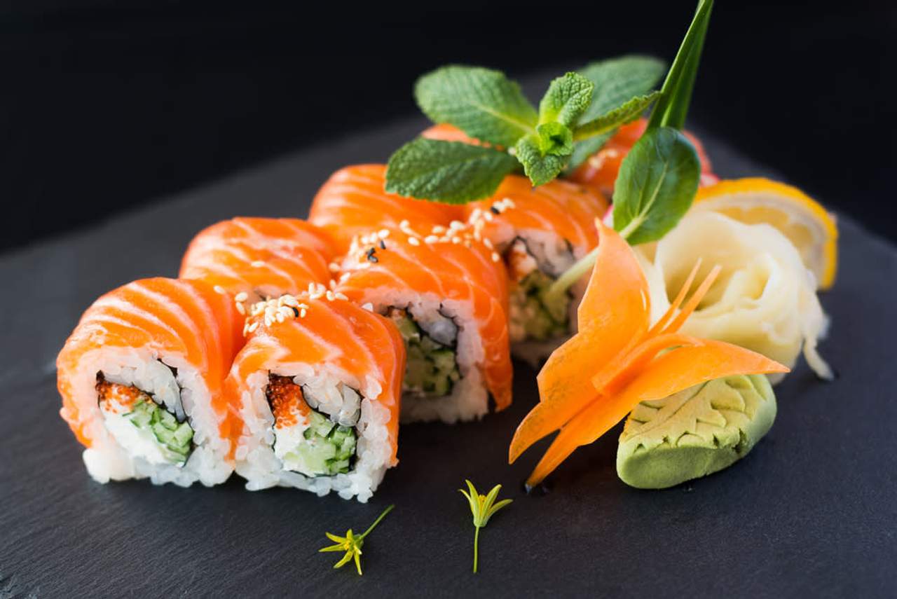 Nori, orez, cremă de brânză , massago, salată iceberg, somon, pesmeți , sos unaghi