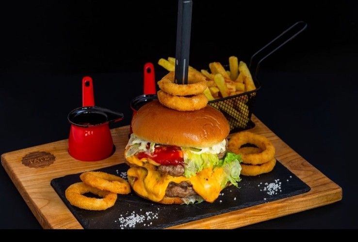 2x burger meso, luk, kajzerica, Heinz kečap, snack sandwich cheese, iceberg salata, tajni burger preliv, pomfrit, pohovani luk