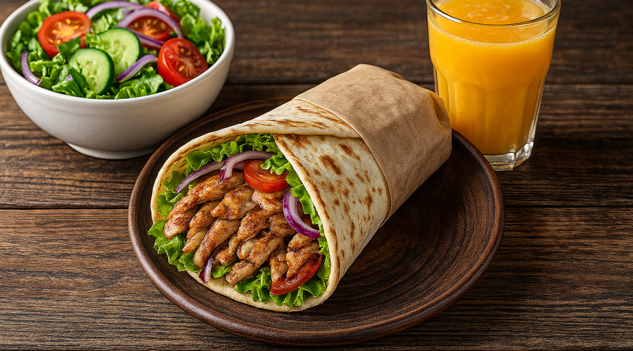 Chicken, Pickles, Onions, Tomatoes, Lettuce, Spicy Mayo Dressing, Coriander, Cucumber, Carrots, Pepper.