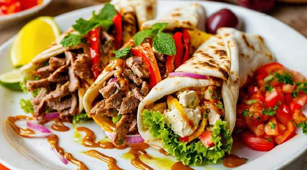 Middle Eastern wrap combining chicken slices and sausage, served with vegetables and sauce inside traditional flatbread.