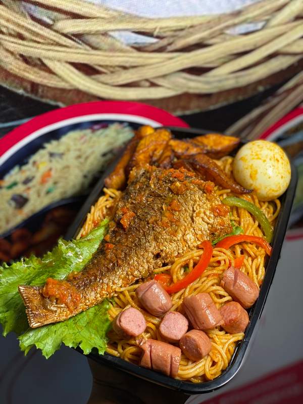 Jollof spaghetti, plantain, hotdog, egg and peppered croaker fish