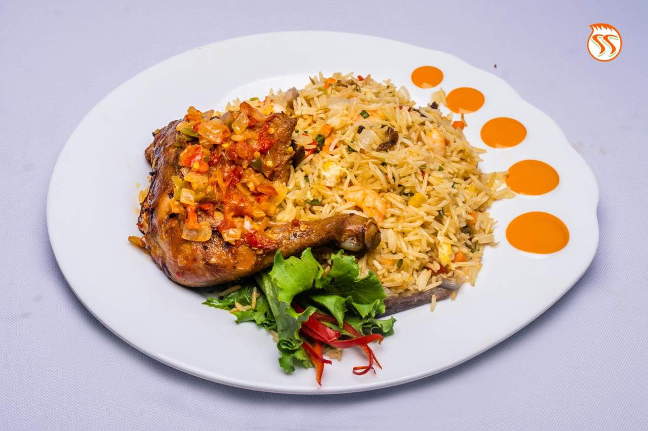 Basmati rice garnished with vegetables, pepper with diced goat meat