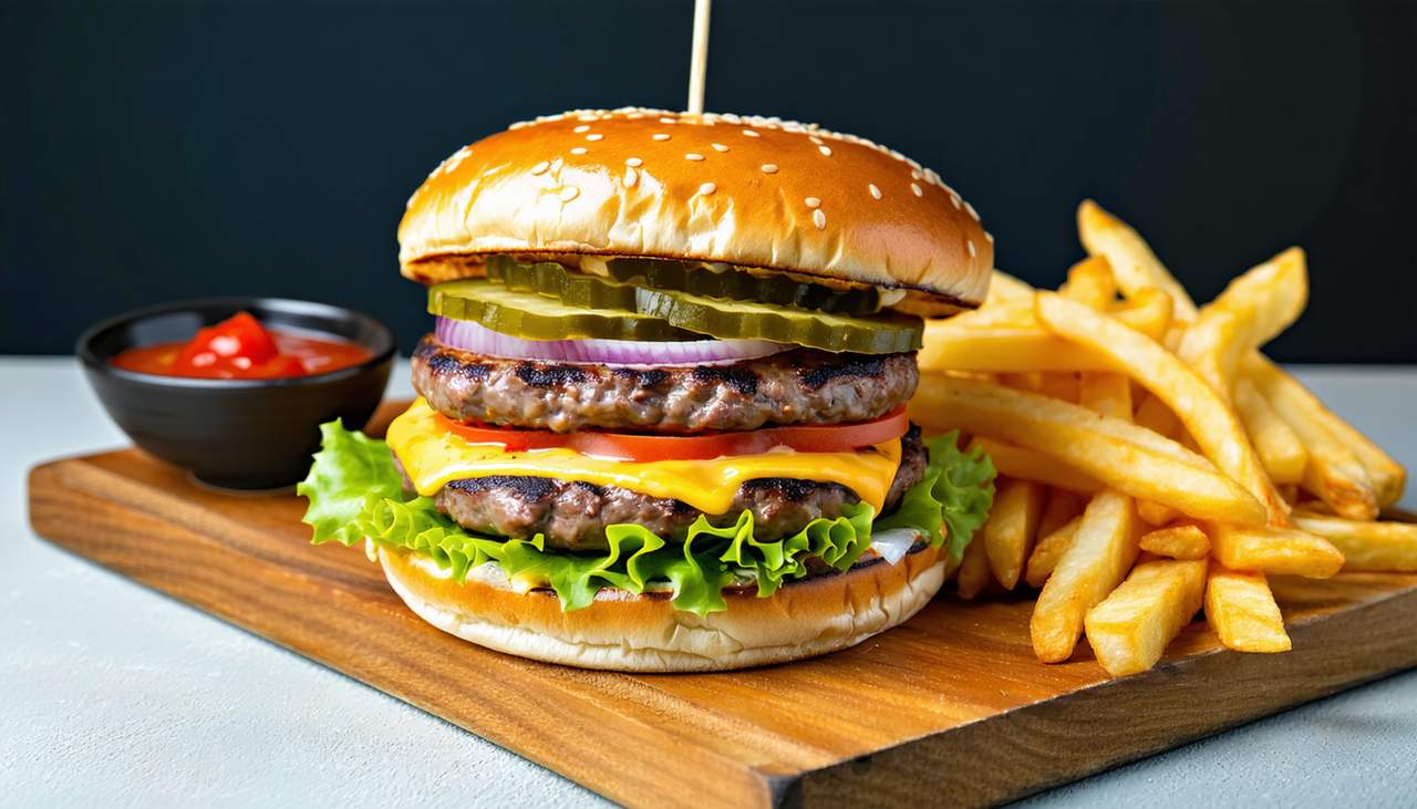 Wolowina 90 g, salata lodowa, pomidor, ogorek konserwowy, bulka, cebulka piklowana, ser cheddar, bbq, majo aioli, bacon, cebula piklowana