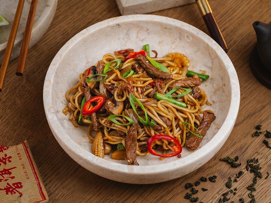 Makaron pszenny, sos teriyaki, wołowina, cebulka, czosnek, papryka słodka, pieczarki, fasolka szparagowa, mini kolby kukurydzy, papryczka chili, kapusta, olej sezamowy, sezam, por, grzyby shiitake