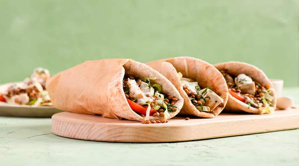 Chleb arabski, mięso, surówki: cebula, pietruszka, pomidor, ogórek, kapusta pekińska, kapusta biała, żółty ser, sos