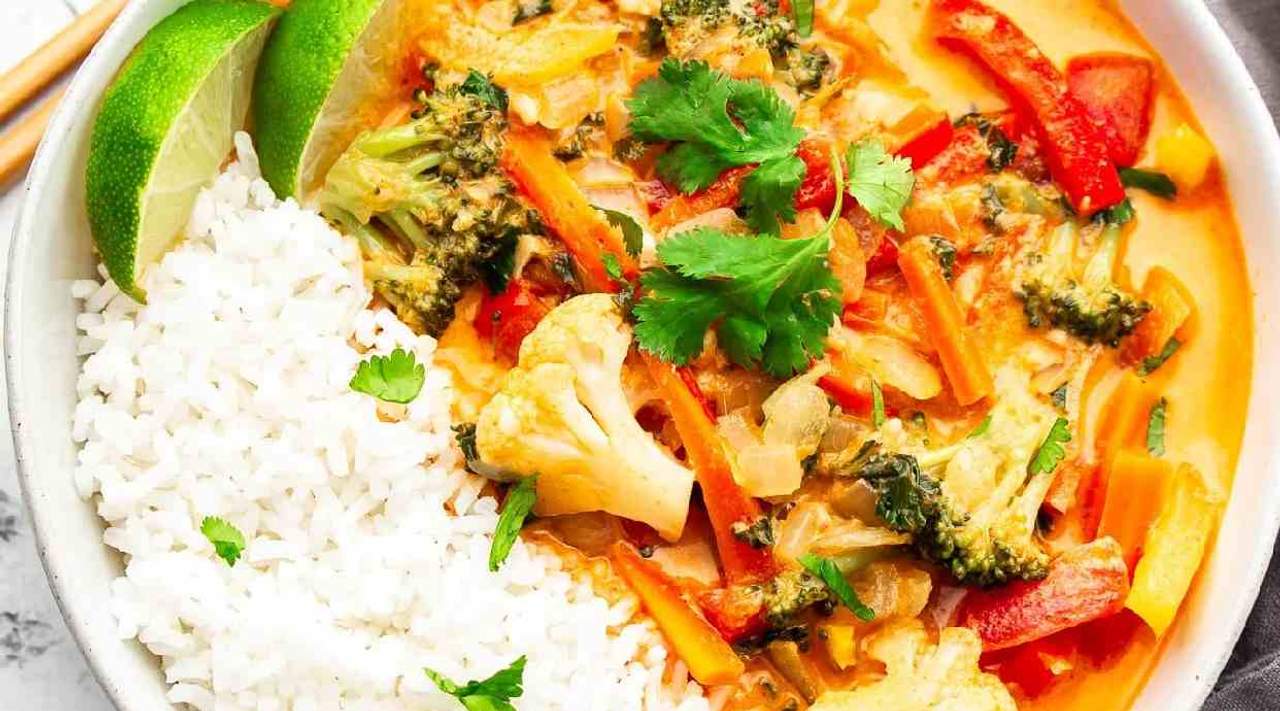 krewetki / kurczak / tofu, makaron ryżowy lub ryż, mleczko kokosowe, kolendra, marchewka, cukinia, kiełki fasoli- kurczak lub tofu
