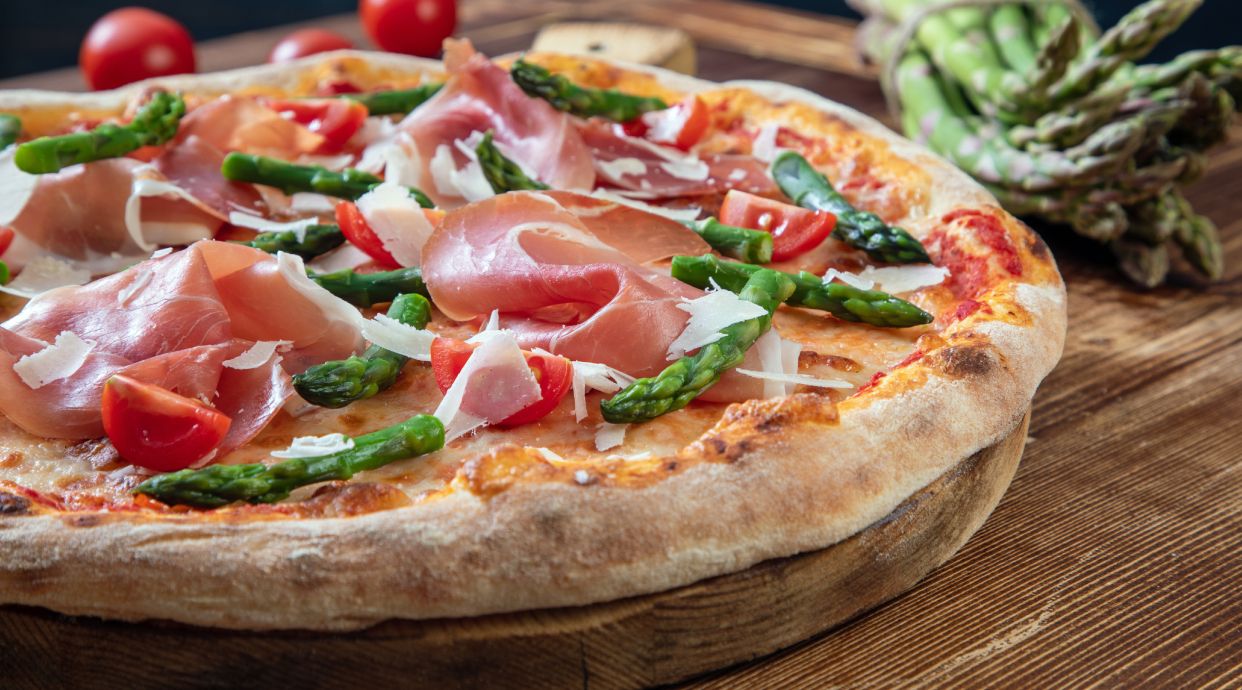 ciasto, sos pomidorowy , ser Mozzarella, szynka surowa dojrzewająca, ser Grana Padano, plastry pomidora, rukola
