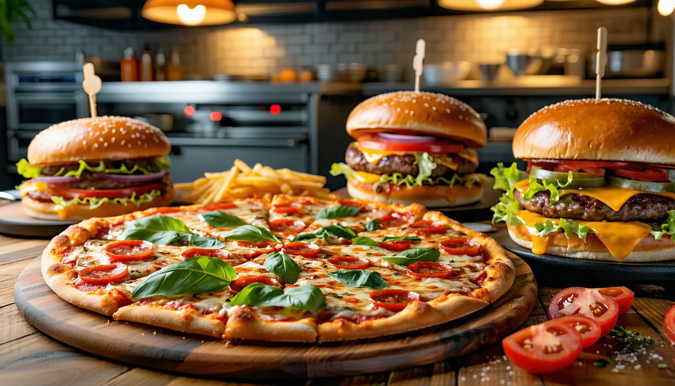 sos pomidorowy, ser, kebab wołowy, cebula, ogórek kiszony, suszone pomidory, kabanos, oregano