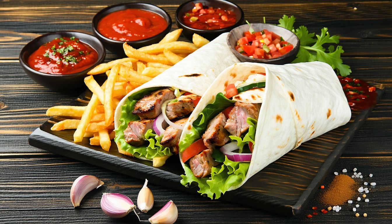 Mięso wołowo-baranie, cebula marynowana, sałata lodowa, sos ogórkowy, sos serowy cheddar, tortilla pszenna + 250g frytek