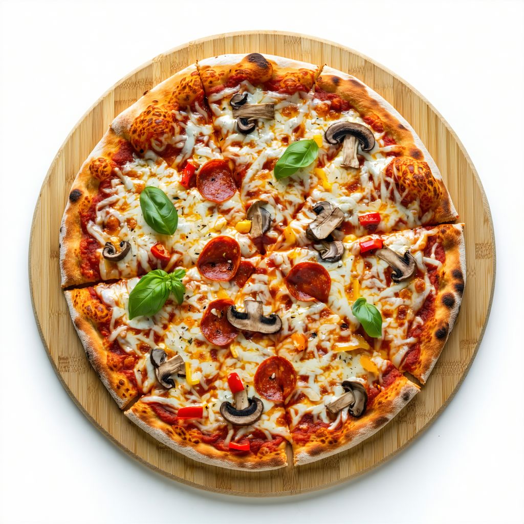 Z sosem, serem, szynką, cebulą, pieczarkami, papryką pepperoni, oregano