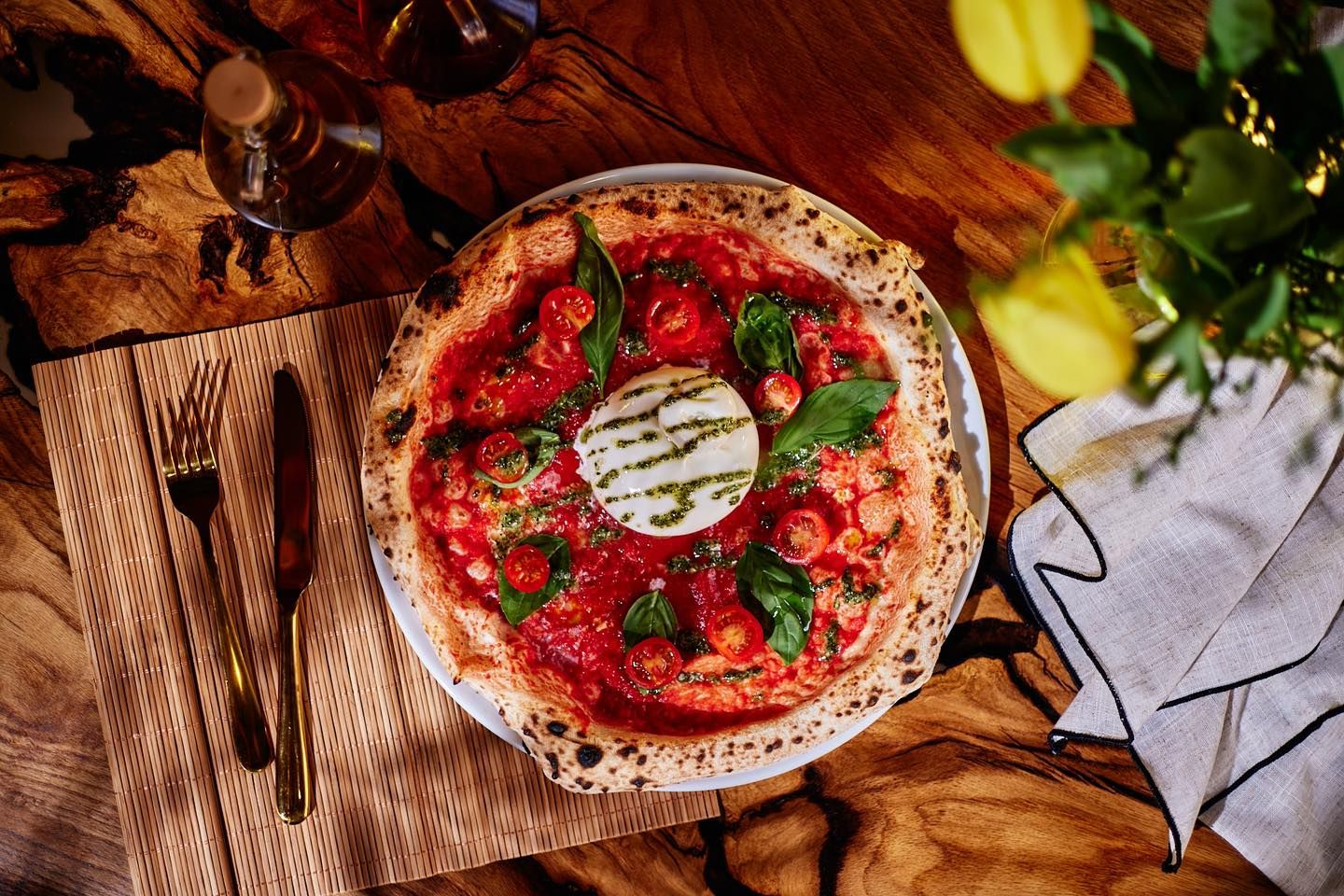 Sos z pomidorów San Marzano, Mozzarella di Bufala Campana DOP, Grana Padano DOP, świeża bazylia, oliwa extra virgin