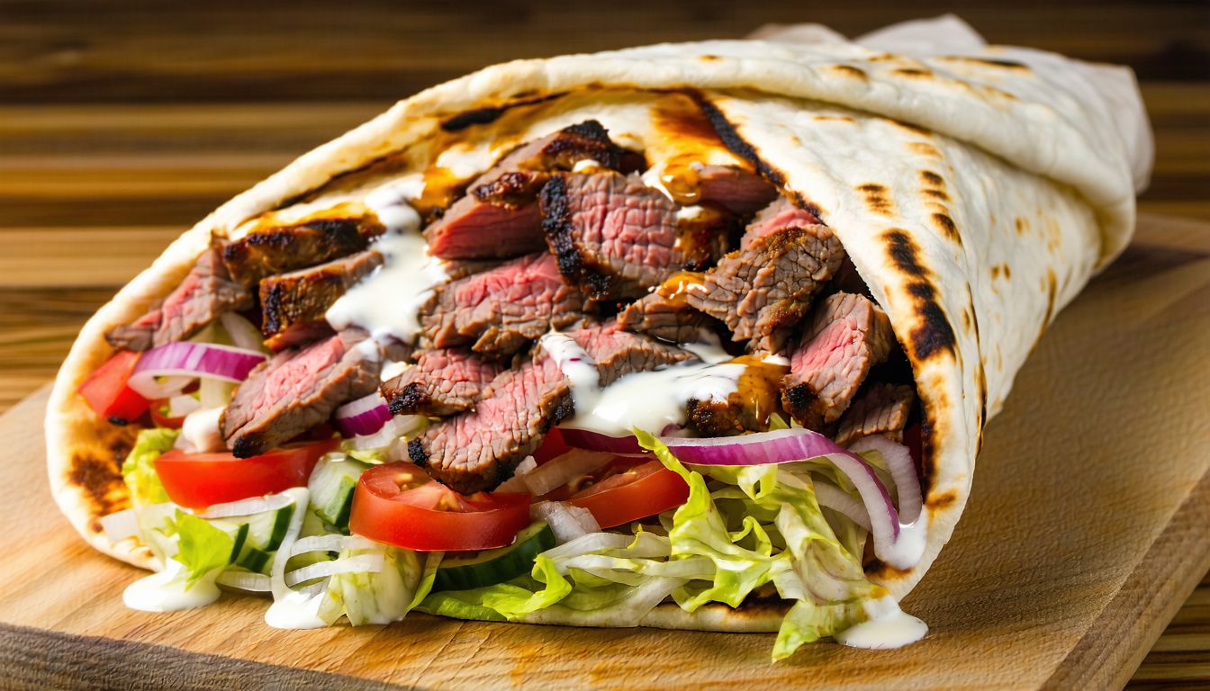 Mięso, surówka, pomidor, ogórek, pasta czosnkowa, sos