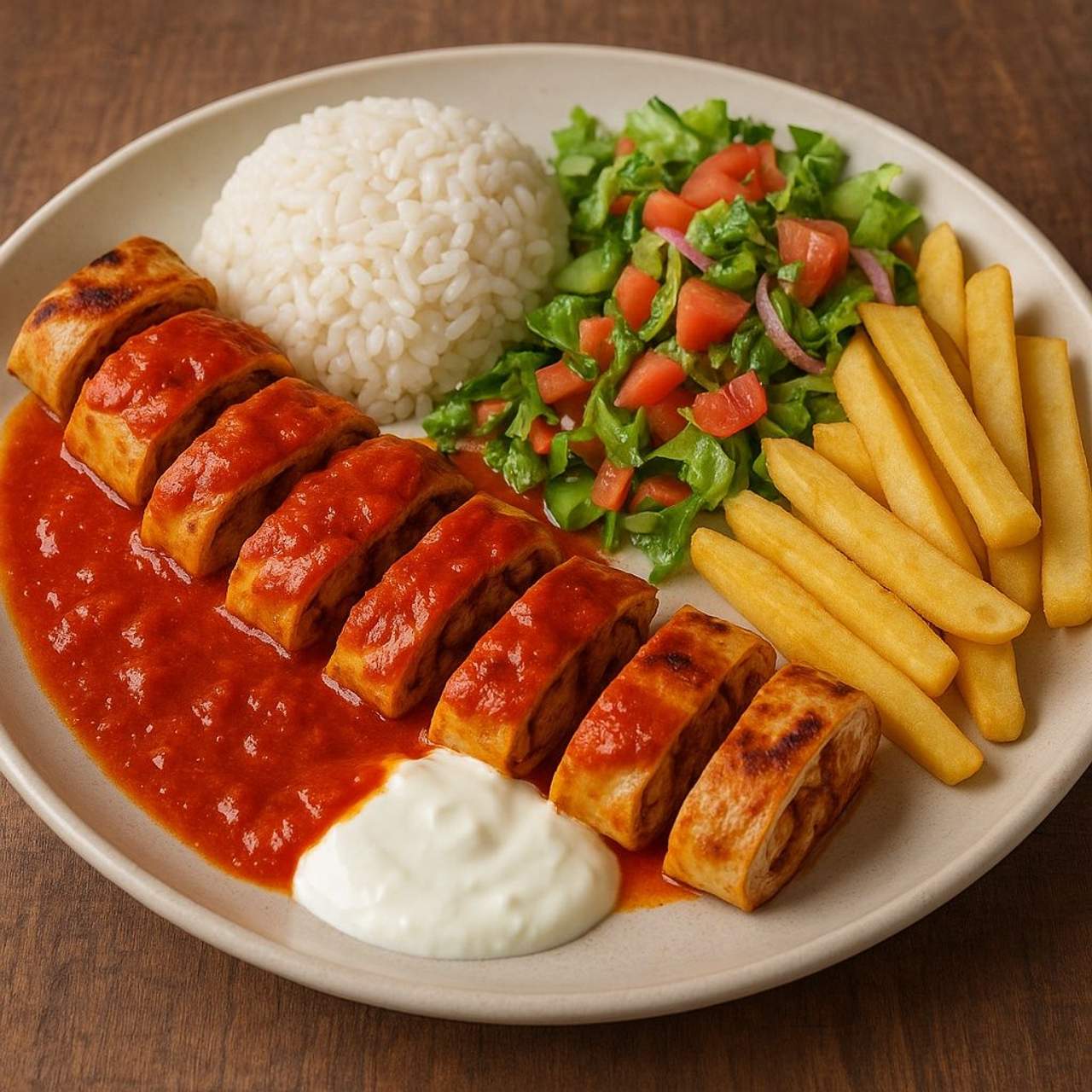 All iskender kebabs are served with rice, yogurt, bread, and tomato sauce.