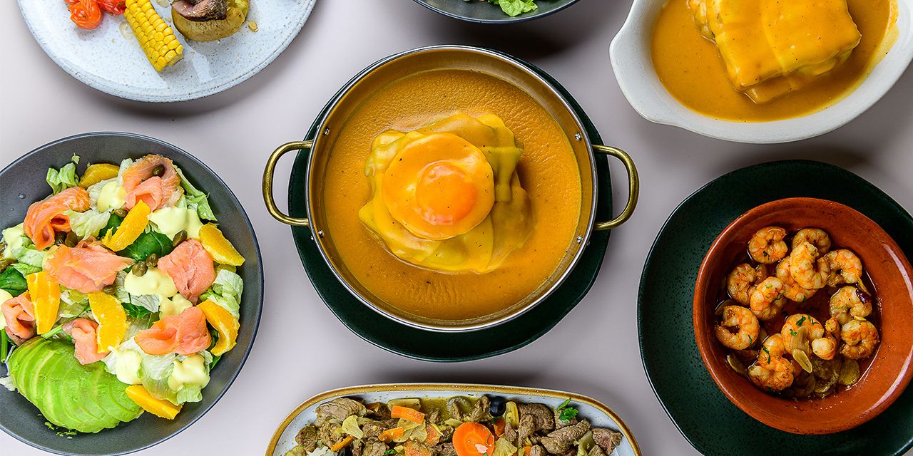 Mini francesinha de novilho, queijo gratinado e ovo, coberta com novo molho de braga.