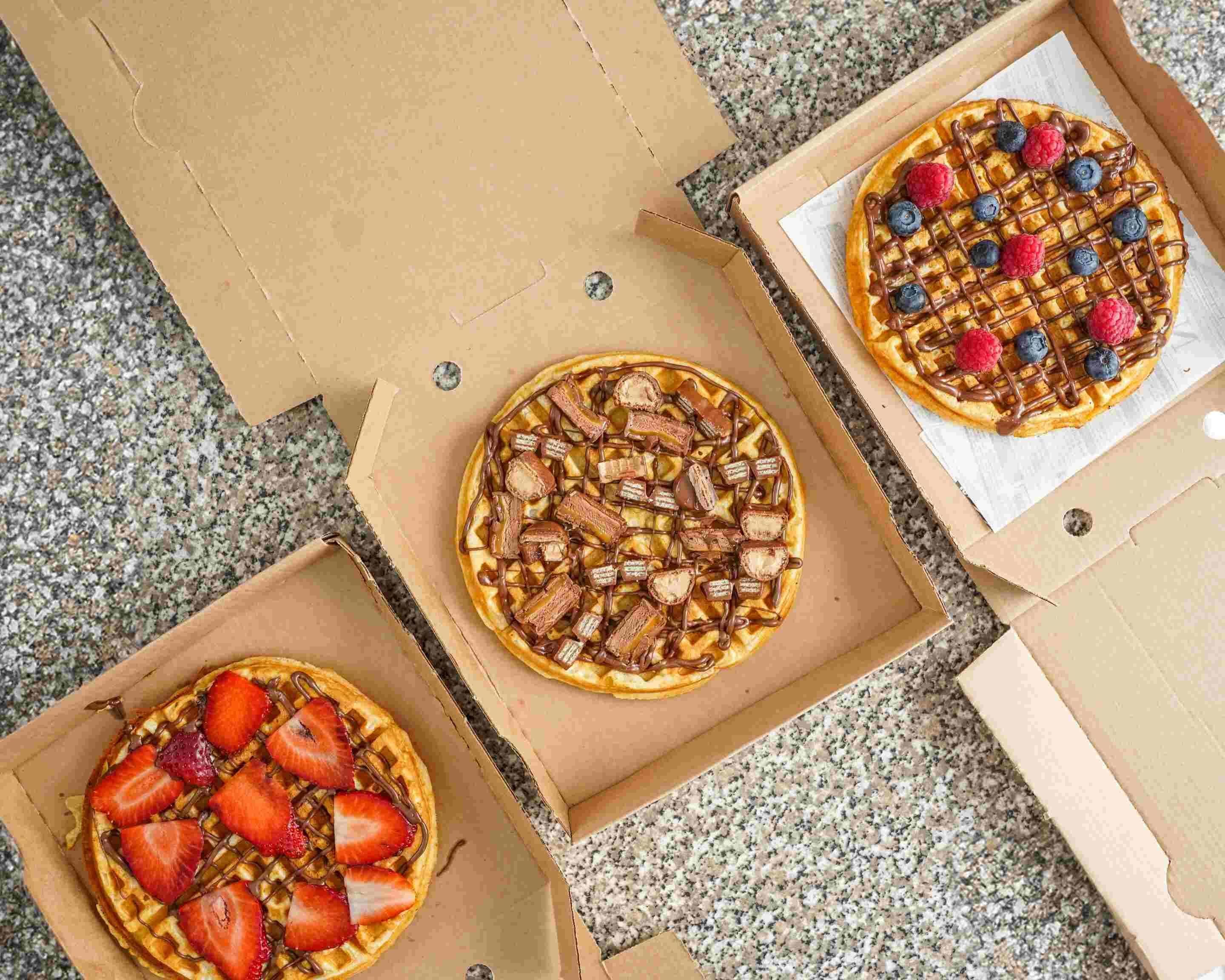 Fresh waffles, served with topped with Nutella Crust Kitkat, Mars, Twix, Bounty, Kinder Bueno & chocolate sauce